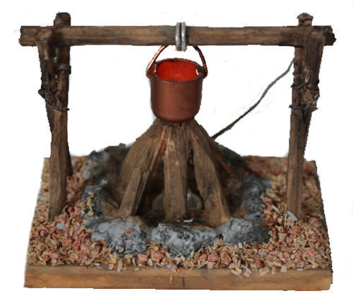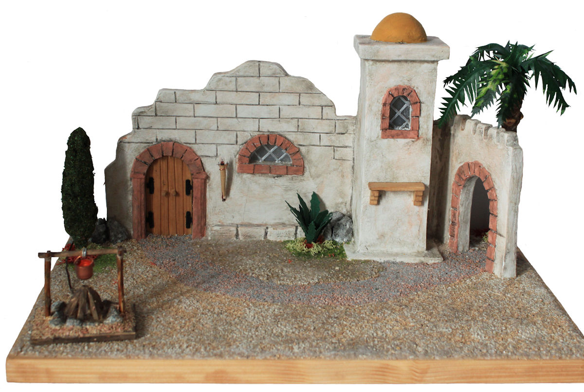 orientalische Krippe mit Turm (LED als Beleuchtung) Lagerfeuer mit Flackerlicht und kleinem Kupferkübel. 2 kleine Agaven, eine Zypresse aus Naturmaterial,